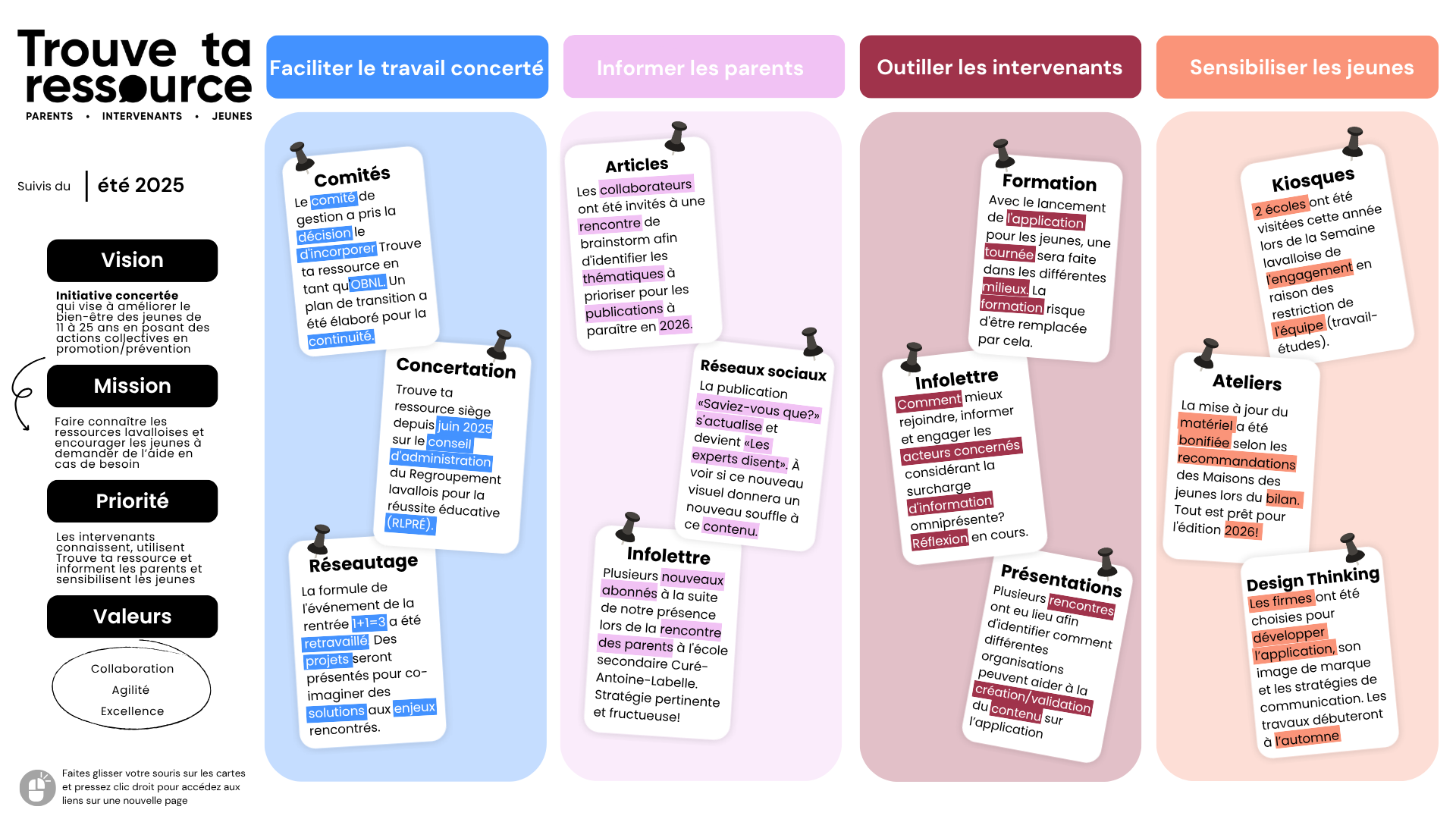 Trouve ta ressource met en œuvre des actions collective afin de contribuer au bien-être des jeunes. À chaque trimestre, un document résumé est réalisé afin de tenir informé ses partenaires qui collaborent de près ou de loin.